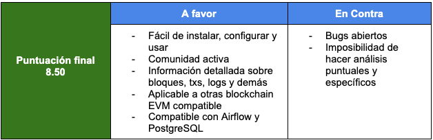 Puedo ver a un ingeniero de datos creando un pipeline de datos que decanta en una BD donde constantemente se agregan nueva info sin mucho esfuerzo, pero me cuesta ver a un científico de datos utilizando la librería para hacer un análisis puntual sin caer en la manipulación de un montón de datos no necesarios. Si estas queriendo analizar datos de bloques o armando un sistema en el cual necesitas todo el detalle posible de bloques, transacciones y logs, definitivamente esta es tu herramienta.